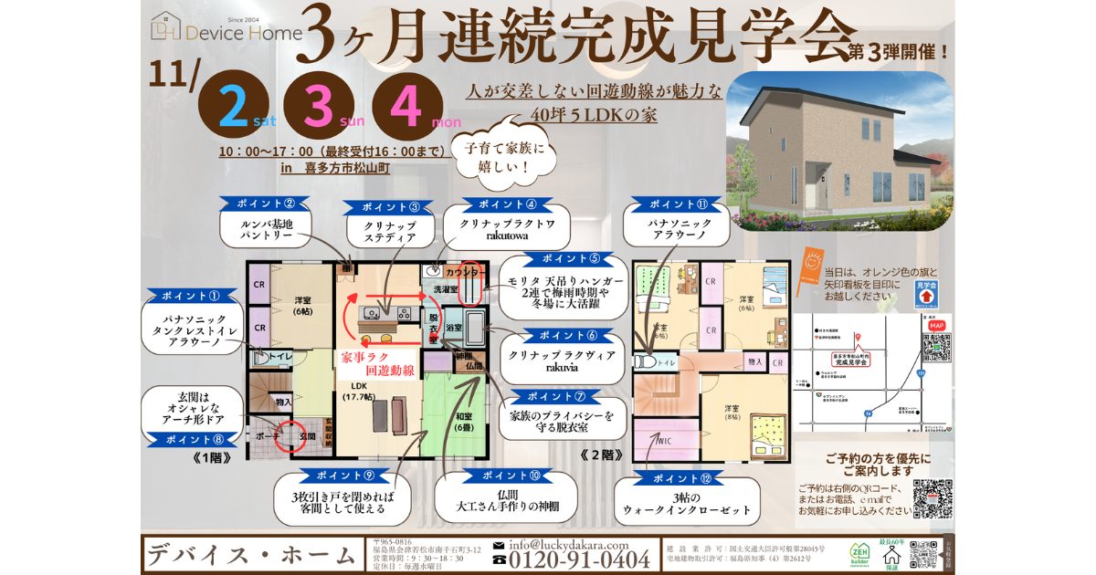 イベントといえばデバイス・ホームでは11月2日(土)~11月4日(月)祝の3日間完成見学会を実施予定となっております。3ヶ月連続第3弾開催!!