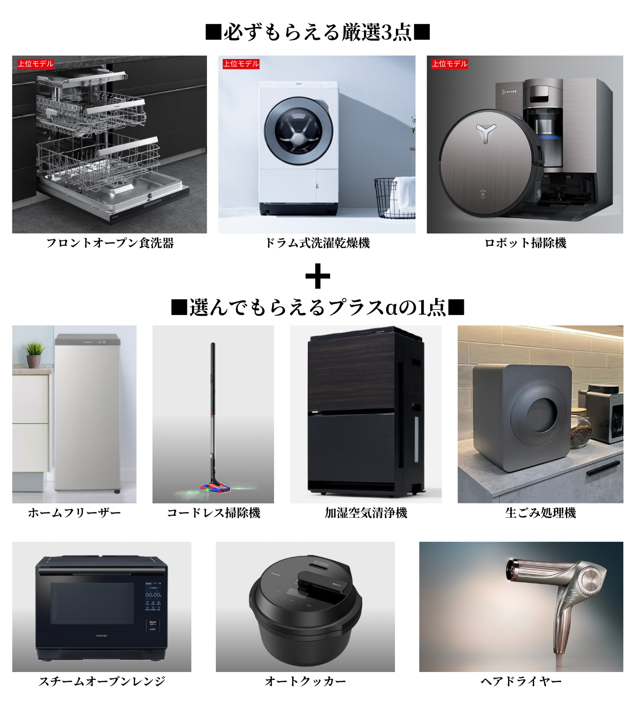 期間中に対象プランの新築住宅をご成約いただいたお客様全員に、家事ラク家電を100万円相当分プレゼント。