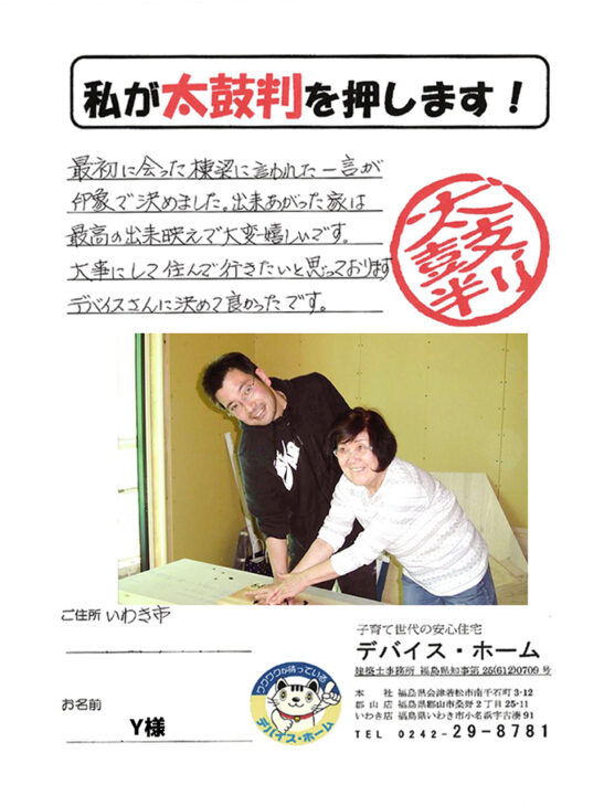 出来あがった家に大満足!デバイスさんにお願いして良かったです いわき市 Y 様 最初に会った棟梁に言われた一言が印象で決めました。出来あがった家は最高の出来映えで大変嬉しいです。大事にして住んで行きたいと思っております。デバイスさんに決めて良かったです。 一覧へ 次へ その他のお客様の声 会津美里町H 様 心も体もポカポカ!快適な住まいに大満足 会津美里町H 様 心も体もポカポカ!快適な住まいに大満足 会津若松市河東Y 様 築70年の家から新築2階建てへ。快適な暮らしに感謝! 会津若松市河東Y 様 築70年の家から新築2階建てへ。快適な暮らしに感謝! いわき市K 様 大関さん・今野さん、そして職人の皆様に感謝 いわき市K 様 大関さん・今野さん、そして職人の皆様に感謝