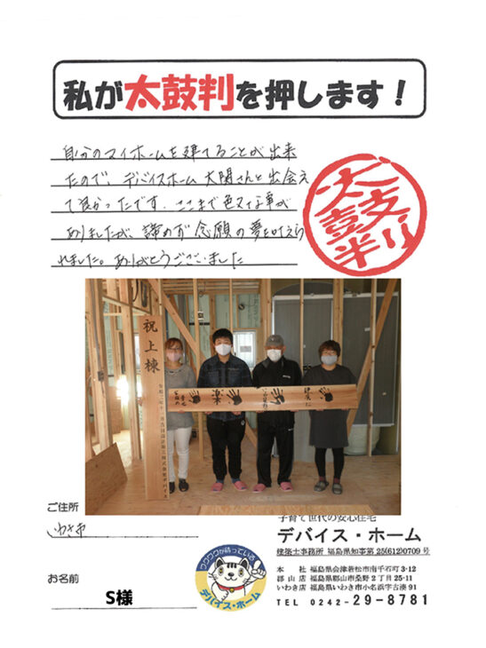 自分のマイホームを建てることが出来たので、デバイスホーム大関さんと出会えて良かったです。ここまで色々な事がありましたが、諦めず念願の夢を叶えられました。ありがとうございました。