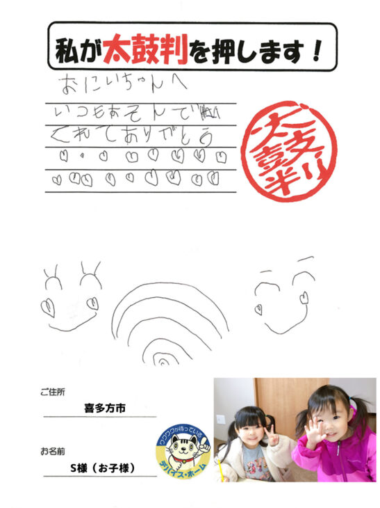 お兄ちゃんへいつも遊んでくれてありがとう 喜多方市 S 様 (お子様) お兄ちゃんへ いつも遊んでくれてありがとう 一覧へ 前へ 次へ その他のお客様の声 会津美里町H 様 心も体もポカポカ!快適な住まいに大満足 会津美里町H 様 心も体もポカポカ!快適な住まいに大満足 会津若松市河東Y 様 築70年の家から新築2階建てへ。快適な暮らしに感謝! 会津若松市河東Y 様 築70年の家から新築2階建てへ。快適な暮らしに感謝! いわき市K 様 大関さん・今野さん、そして職人の皆様に感謝 いわき市K 様 大関さん・今野さん、そして職人の皆様に感謝