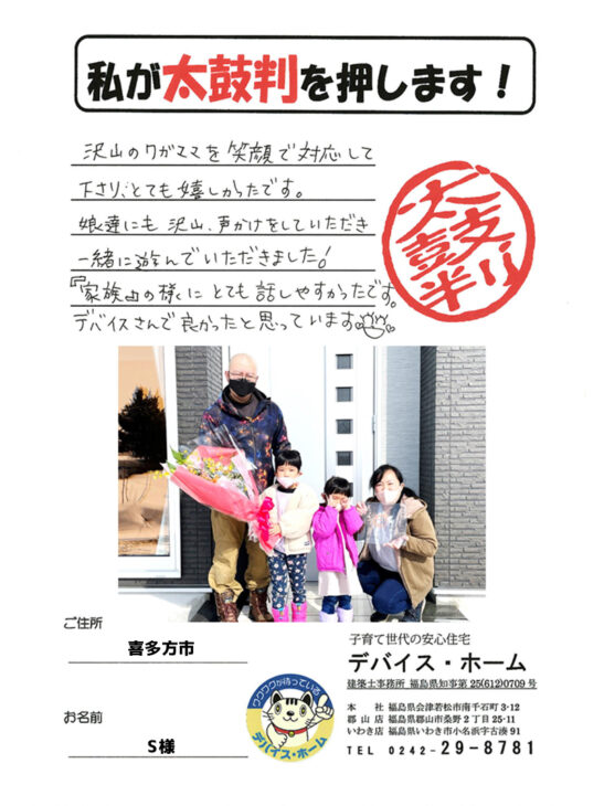沢山のワガママを笑顔で対応して下さり、とても嬉しかったです。娘達にも沢山、声かけをしていただき一緒に遊んでいただきました!「家族」の様にとても話しやすかったです。デバイスさんで良かったと思っています(^^)