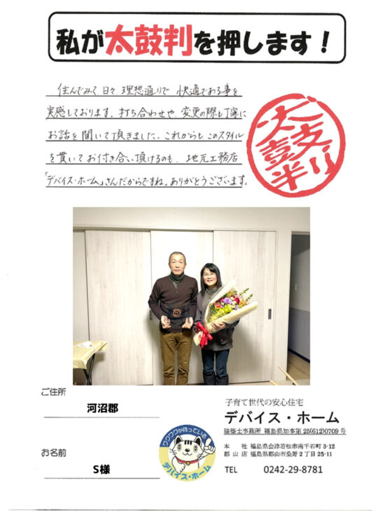 住んでみて、日々、理想通りで快適であることを実感しております。打ち合わせや、変更の際も丁寧にお話を聞いて頂きました。これからも、このスタイルを貫いてお付き合い頂けるのも、地元工務店「デバイスホーム」さんだからこそですね。ありがとうございます。