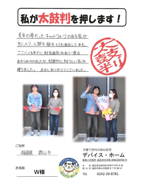 長年の夢だったキャットウォークのあるお家が手に入り、人間も猫もとても満足しています。ここにくるまでに、紆余曲折があり一度はあきらめかけましたが、結果的にすばらしい家が建ちました。本当にありがとうございました。