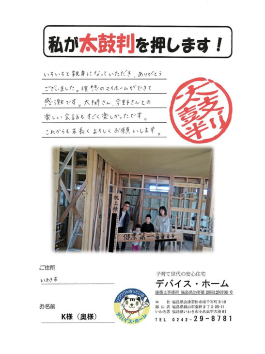 いろいろと親身になっていただき、ありがとうございました。理想のマイホームができて感激です。大関さん、今野さんとの楽しい会話もすごく楽しかったです。これからも末長くよろしくお願いします。