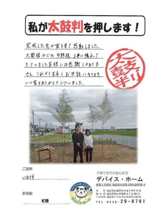 完成した我が家を見て、感動しました。大関様はじめ今野様、工事に携わって下さいました皆様には感謝しかありません。これから末永くお世話になります。いい家をありがとうございました。