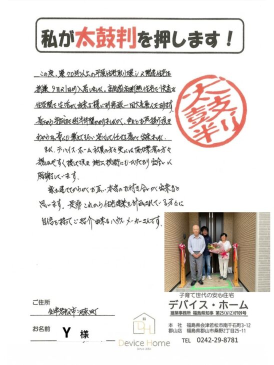 この度、築70年以上の平屋住宅を取り壊し、2階建て住宅を新築9月21日より入居しました。高気密高断熱住宅で快適な住空間で生活が出来る様になり家族一同大変喜んでおります。着工から完成まで約半年間かかりましたが、色々とお声掛け頂き分からないことにも教えてもらう、安心して任せることが出来ました。また、デバイス・ホーム社員の方々、更には協力業者の方々親しみやすく接して頂き、施工技術にもたけており出会いに感謝しています。家を建ててからが、お互いの本当のお付き合いが出来ると思います。是非これから住宅建築を計画されている方々に自信をもってご紹介出来るハウス・メーカーさんです。